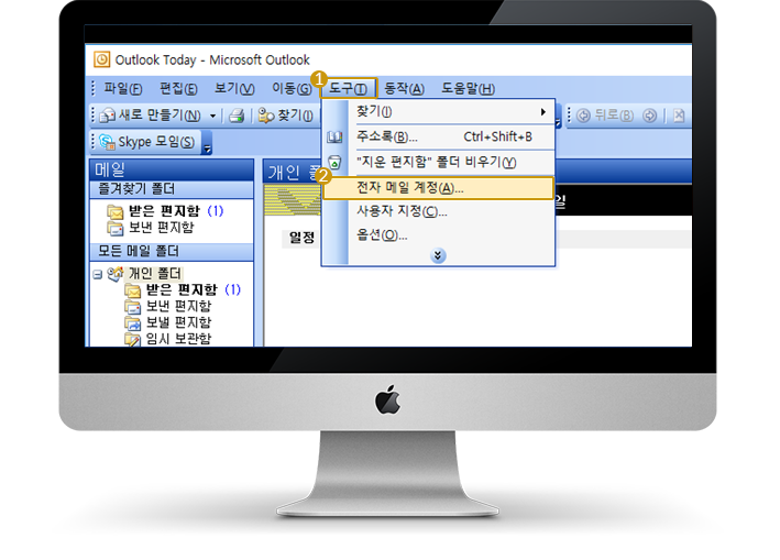 아웃룩 2003 실행 후 도구 메뉴에서 전자 메일 계정을 클릭합니다.