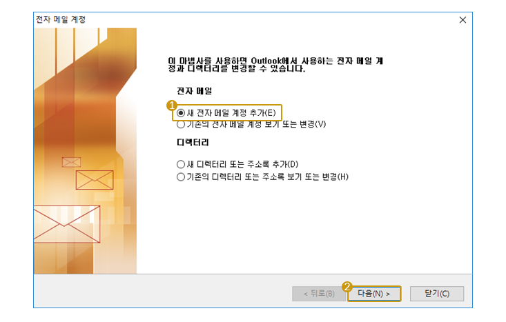 새 전자 메일 계정 추가를 선택 후 다음 버튼을 선택합니다.