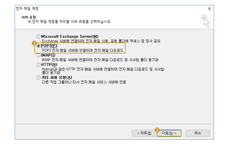 서버 유형 페이지에서 POP3에 체크 후 다음 버튼을 클릭합니다.