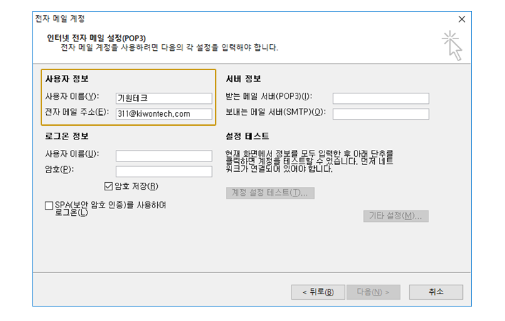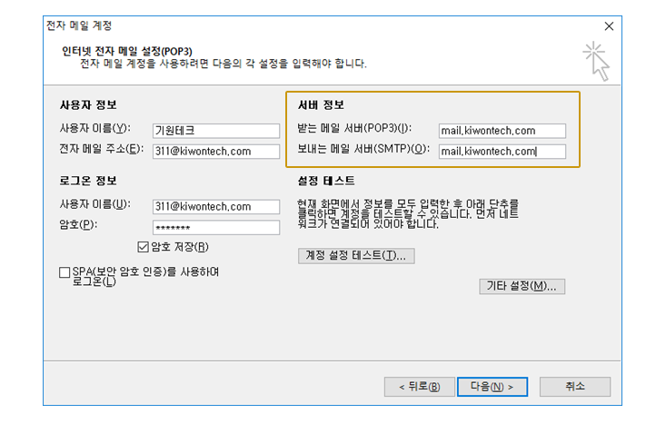 서버 정보를 입력합니다. 서버 정보는 [mail.기업별 사용 중 도메인 이름]을 입력하시면 됩니다.