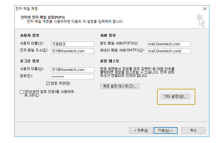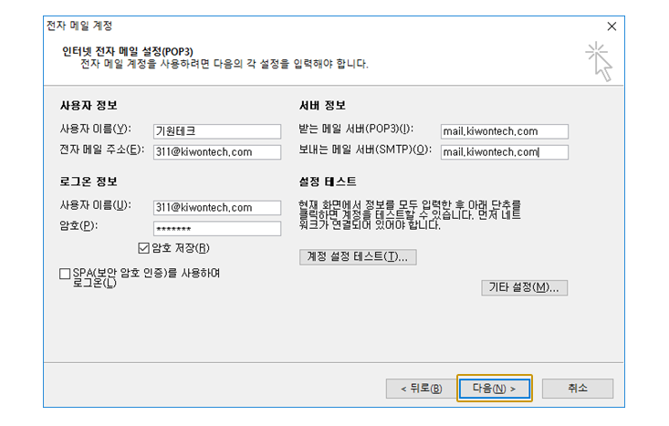 기타 설정 팝업이 닫히고 나면 계정 설정 창에서 다음 버튼을 클릭합니다.