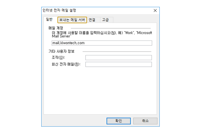 기타 설정 클릭 시 표시되는 팝업 창에서 보내는 메일 서버 탭을 클릭합니다.
