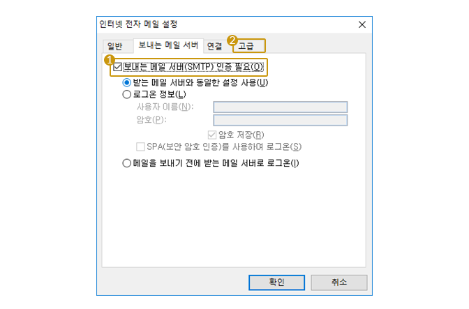 보내는 메일 서버 인증 체크 박스를 클릭하여 활성화시키고 고급 탭을 클릭합니다.