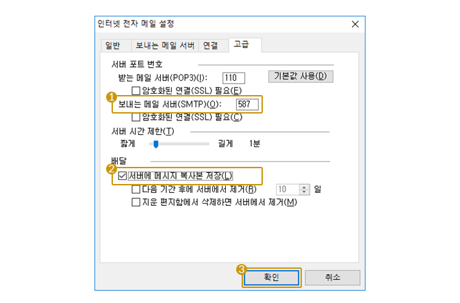 보내는 메일 서버 포트에 587을 입력 후 서버에 복사본 저장에 체크하고 확인 버튼을 클릭합니다.